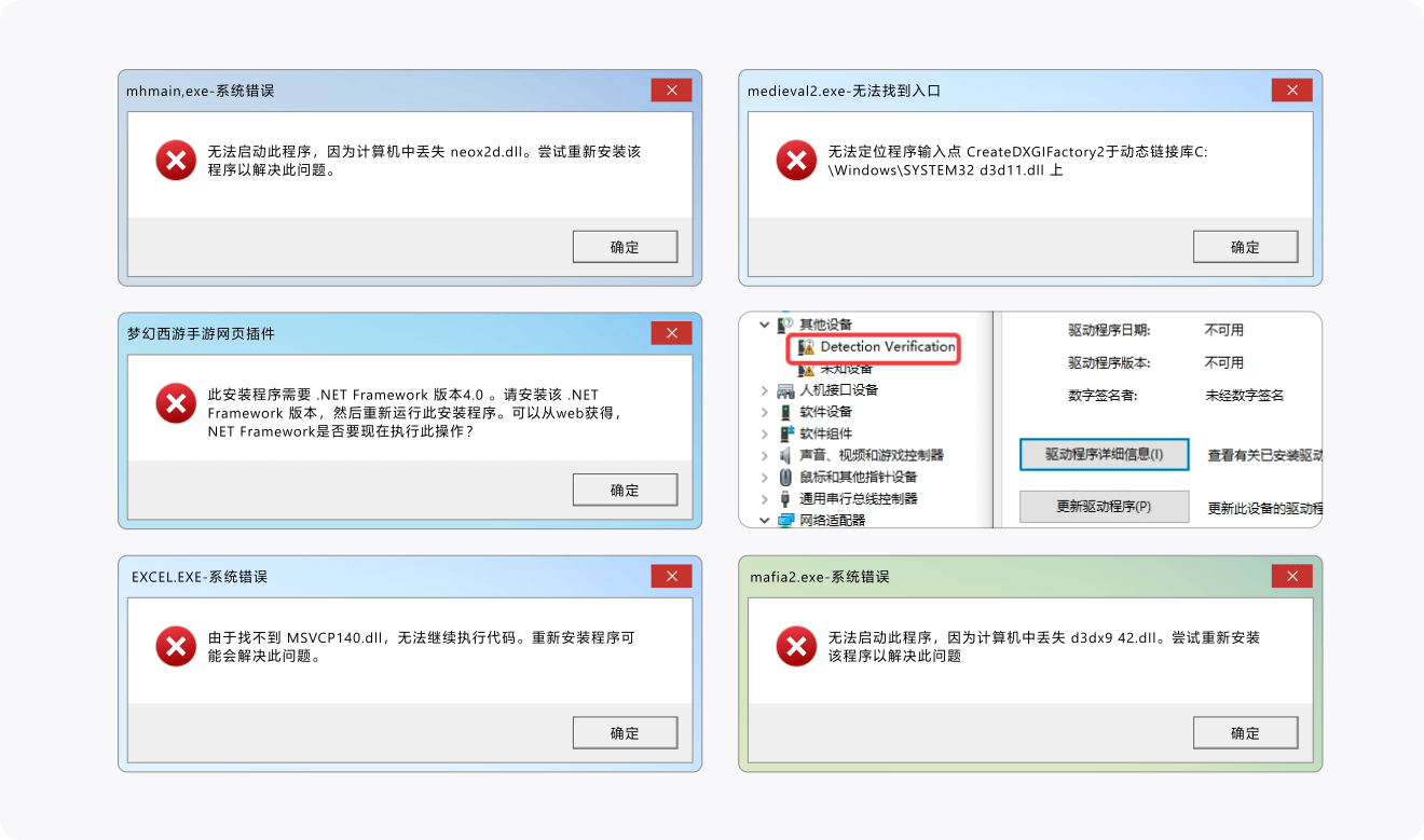 系统dll找不到,可手动修复、游戏.exe文件被杀毒软件误杀、低版本dll文件,常年未更新升级等